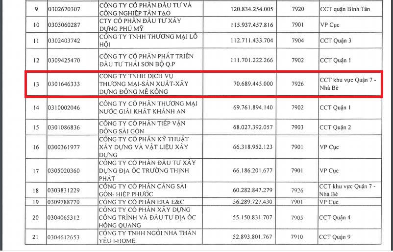 Theo Thông báo về việc công khai thông tin người nộp thuế nợ thuế trên phương tiện thông tin đại chúng kỳ 02/2020 vừa được Cục Thuế TPHCM công bố, Công ty Đông Mê Kông là một trong những doanh nghệp đang nợ số tiền thuế lớn. Tổng số tiền thuế doanh nghiệp này nợ tính đến thời điểm 30/9/2020 là hơn 70 tỷ đồng.