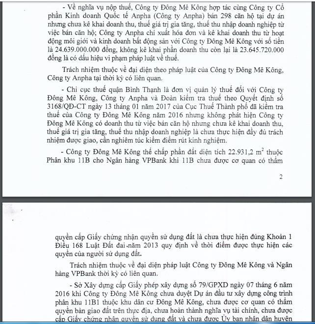 Về nghĩa vụ nộp thuế, Công ty Đông Mê Kông hợp tác cùng Công ty CP Kinh doanh quốc tế An Pha (Công ty An Pha) bán 298 căn hộ tại dự án nhưng chưa kê khai doanh thu, thuế giá trị gia tăng, thuế thu nhập doanh nghiệp từ việc bán căn hộ. Công ty An Pha chỉ xuất hóa đơn và kê khai doanh thu từ hoạt động môi giới và kinh doanh bất động sản với Công ty Đông Mê Kông số tiền hơn 24,6 tỷ đồng, không kê khai phần doanh thu còn lại hơn 23,6 tỷ đồng là có dấu hiệu vi phạm pháp luật về thuế.