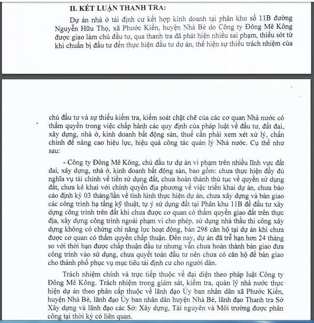 Thanh tra TP HCM cho biết, qua thanh tra đã phát hiện nhiều sai phạm, thiếu sót từ khi chuẩn bị đầu tư đến thực hiện đầu tư dự án, thể hiện sự thiếu trách nhiệm của chủ đầu tư và sự thiếu kiểm tra, rà soát của các cơ quan Nhà nước có thẩm quyền trong việc chấp hành các quy định của pháp luật về đầu tư, đất đai, xây dựng, nhà ở, kinh doanh bất động sản, thuế cần phải xem xét xử lý, chấn chỉnh để nâng cao hiệu lực, hiệu quả công tác quản lý Nhà nước.