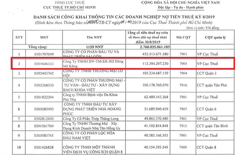 Đây không phải là lần đầu tiên Đông Mê Kông nằm trong danh sách các doanh nghiệp nợ thuế kéo dài của Cục thuế TP HCM. Trước đó, trong đợt công bố thông tin doanh nghiệp nợ thuế kỳ 1/2020 của Cục thuế TP HCM, Công ty Đông Mê Kông cũng nợ thuế hơn 114 tỷ đồng