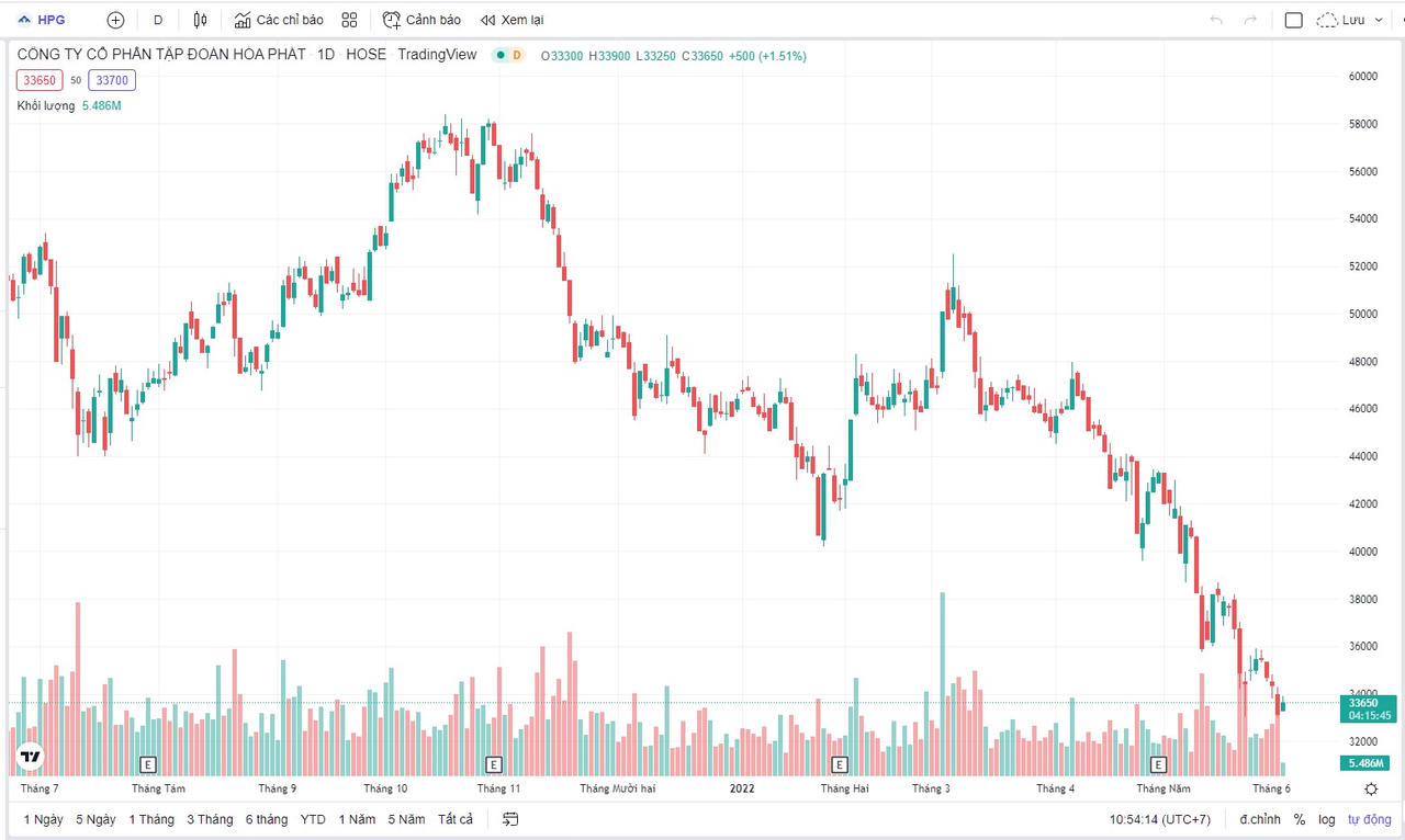 Còn trên thị trường chứng khoán, cổ phiếu HPG ghi nhận sự giảm giá mạnh kể từ thời điểm cuối tháng 11/2021 (khi đó cổ phiếu HPG được giao dịch ở mức 58.000 đồng/cổ phiếu). Thời điểm hiện tại thị giá cổ phiếu HPG giao dịch ở mức 33.000 đồng/cổ phiếu (tức giảm 43% so với thời điểm trước đó).
