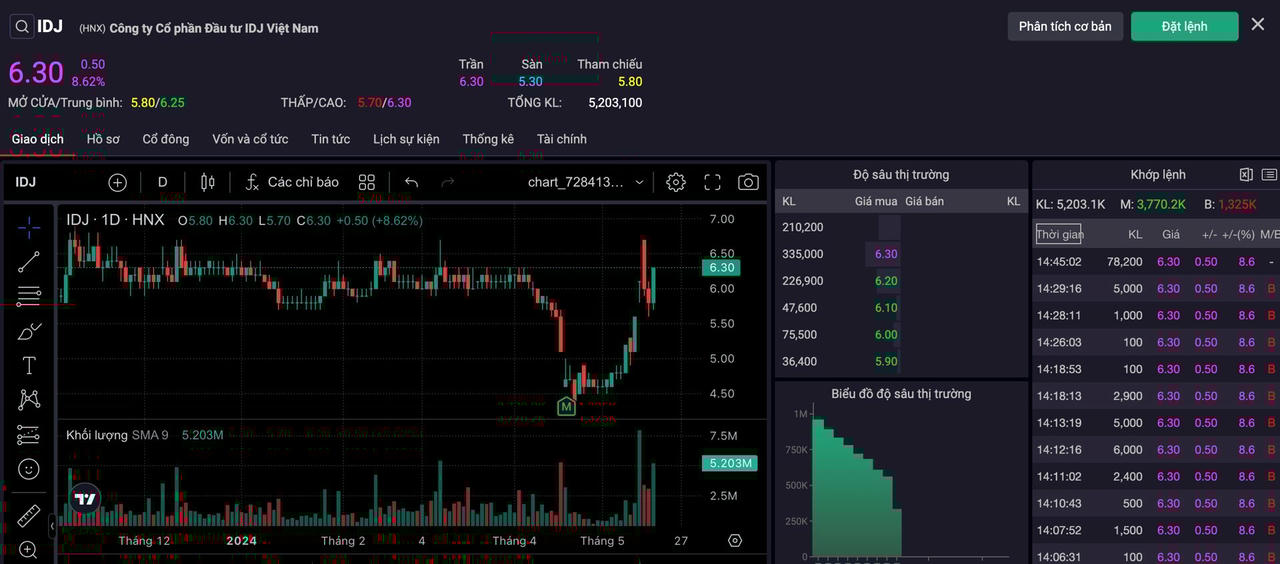 Đáng nói, IDJ là mã cổ phiếu có thanh khoản cao nhất khi số lượng cổ phiếu 'sang tay' mỗi phiên lên tới hàng triệu đơn vị. Trong phiên giao dịch cuối tuần, bất chấp việc ĐHĐCĐ thường niên không bị tổ chức và cổ phiếu vẫn đang bị duy trì diện cảnh báo, mã này vẫn tăng hết biên độ 8,62%, lên mức 6.300 đồng/cp với hơn 5,2 triệu cổ phiếu được khớp lệnh. 'Cháy hàng', kết thúc phiên giao dịch, cổ phiếu IDJ vẫn còn dư mua hơn 1,5 triệu đơn vị.
