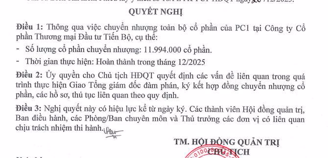 Cụ thể, theo thông tin được công bố, PC1 muốn chuyển nhượng toàn bộ gần 12 triệu cổ phiếu đang sở hữu tại Thương mại Đầu tư Tiến Bộ. Thời gian thực hiện trong tháng 12/2025.
