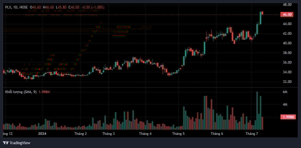 Từ giữa tháng 4 vừa qua, cổ phiếu PLX của Petrolimex cũng liên tục tăng mạnh. Sau chưa đầy 2 tháng, thị giá PLX đã tăng khoảng 30%. Tính từ đầu năm 2024 đến nay, cổ phiếu PLX đã tăng 32% qua đó đẩy vốn hóa thị trường của Petrolimex lên gần 56.000 tỷ đồng (hơn 2 tỷ USD).