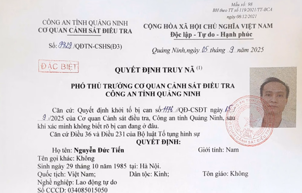 Quyết định truy nã đối tượng Nguyễn Đức Tiến kẻ cầm đầu đường dây. Ảnh: CACC