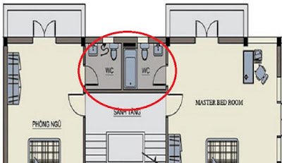 Sai lầm lớn nhất trong thiết kế phòng tắm là đặt nó ở vị trí trung tâm ngôi nhà. Theo phong thủy, đây là điều cực hung, bởi phòng tắm là nơi thường xuyên không sạch sẽ, nếu xây ở trung tâm nhà sẽ khiến “xú uế nhập trung cung”, cả ngôi nhà sẽ bị ô uế.