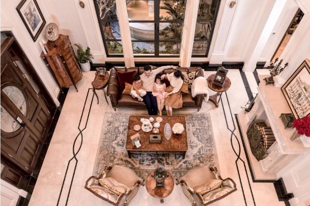 Tùy vào gu thẩm mỹ và sở thích của gia chủ mà nội thất tân cổ điển Pháp được cá nhân hóa và mang một diện mạo riêng. Những chủ nhân tại phân khu Hoa Hồng có thể bố trí trần nhà thạch cao chạm trổ hoa văn cầu kỳ, với hệ thống đèn chùm làm điểm nhấn. Cầu thang cũng là một chi tiết trang trí đắt giá và có thể được thiết kế theo hình dải lụa mềm mại hoặc đối xứng theo phong cách hoàng gia, với những bậc thang làm bằng đá hoa cương hay lót gỗ cùng nhiều họa tiết ở tay vịn lan can.