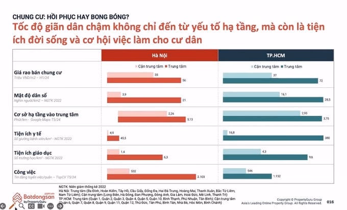 Tuy nhiên, nếu như ở TP. HCM, các dự án chung cư nhận được sự quan tâm từ khu vực ven đô đến trung tâm thì tại Hà Nội, sự chênh lệch về giá của 2 khu vực này lại rõ rệt. Giải thích về vấn đề này, chuyên gia của Batdongsan.com.vn đánh giá những tiện ích về tiện ích về y tế, giáo dục của Hà Nội phân bố không đồng đều tại như tại TP. HCM. Yếu tố này đã góp phần đưa tới việc chung cư tại trung tâm Hà Nội tăng vọt khiến nhiều người hoài nghi về sự xuất hiện của bong bóng bất động sản.