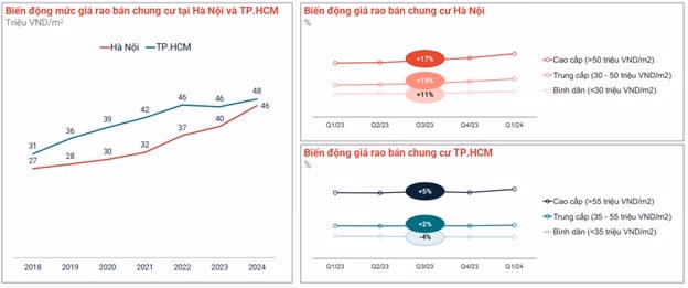 Đặc biệt, với phân khúc chung cư, trong vòng 6 tháng đàu năm 2024 đã chứng kiến sự tăng giá mạnh mẽ của loại hình bất động sản này tại Hà Nội. So sánh giữa 2 đô thị lớn là Hà Nội và TP. HCM, nếu như trong vòng 10 năm qua, giá chung cư tại TP. HCM cao hơn và tăng mạnh hơn so với chung cư Hà Nội thì trong giai đoạn tháng 3/2024 lại chứng kiến đà tăng vọt của chung cư Hà Nội đã tiệm cận so với TP. HCM. Theo thống kê của batdongsan.com.vn, sau 6 năm từ năm 2018, tốc độ tăng giá trung bình của chung cư ở Hà Nội lên đến 70%, còn TP. HCM là 55%.