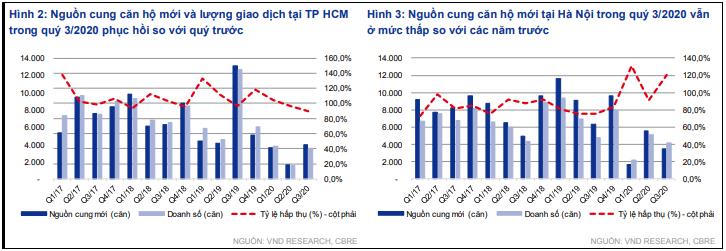 Theo CBRE Việt Nam, thị trường căn hộ tại TP HCM trong quý 3/2020 ghi nhận mức hồi phục đáng kể theo quý, với lượng mở bán tăng 141% so với quý trước nhưng vẫn giảm 70% so với cùng kỳ năm 2019, đạt 3.964 căn, lượng giao dịch tăng 125% so với quý trước nhưng giảm 72% so với cùng kỳ năm ngoái, đạt 3.552 căn.
