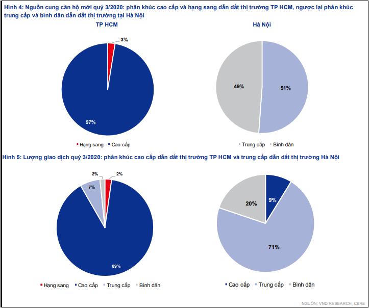 Theo thống kê nguồn cung và lượng giao dịch mới trong quý 3/2020, phân khúc cao cấp và hạng sang dẫn dắt thị trường TP.HCM, ngược lại phân khúc trung cấp và bình dân dẫn dắt thị trường Hà Nội.