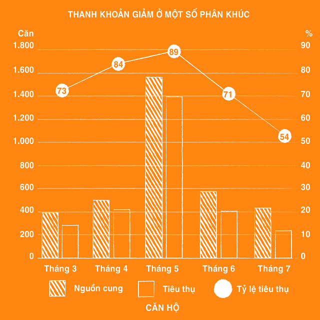 Đối với thị trường BĐS phân khúc căn hộ tại TP HCM và vùng giáp ranh trong tháng 7 ghi nhận nguồn cung mới đạt khoảng 2.159 căn đến từ 13 dự án mở bán, giảm 25% so với tháng trước. Mặc dù vậy, lượng tiêu thụ chỉ đạt ở mức xấp xỉ 54% tổng giỏ hàng mở bán trong tháng, đây cũng là mức thấp nhất ghi nhận được kể từ khi lệnh giãn cách xã hội được gỡ bỏ vào cuối năm trước.