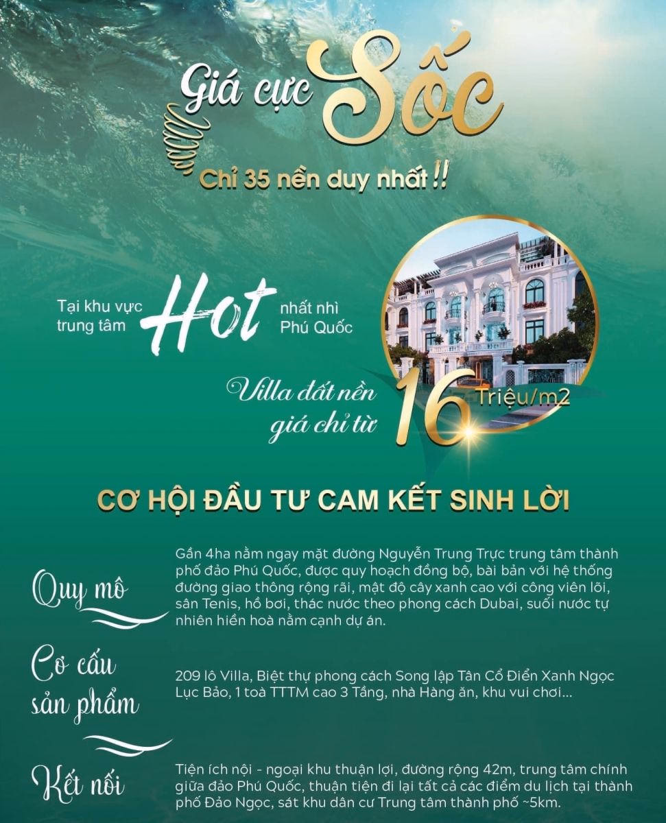 Khu dân cư Emerald Phú Quốc có quy mô 209 nền villa, biệt thự phong cách song lập tân cổ điển Xanh Ngọc Lục Bảo; 1 tòa trung tâm thương mại cao 3 tầng, nhà hàng ăn, khu vui chơi. Dự án kết nối tiện ích nội – ngoại khu thuận lợi, đường rộng 42m, trung tâm chính giữa đảo Phú Quốc, thuận tiện đi lại tất cả các điểm du lịch của Đảo Ngọc”, một quảng cáo giới thiệu về dự án.