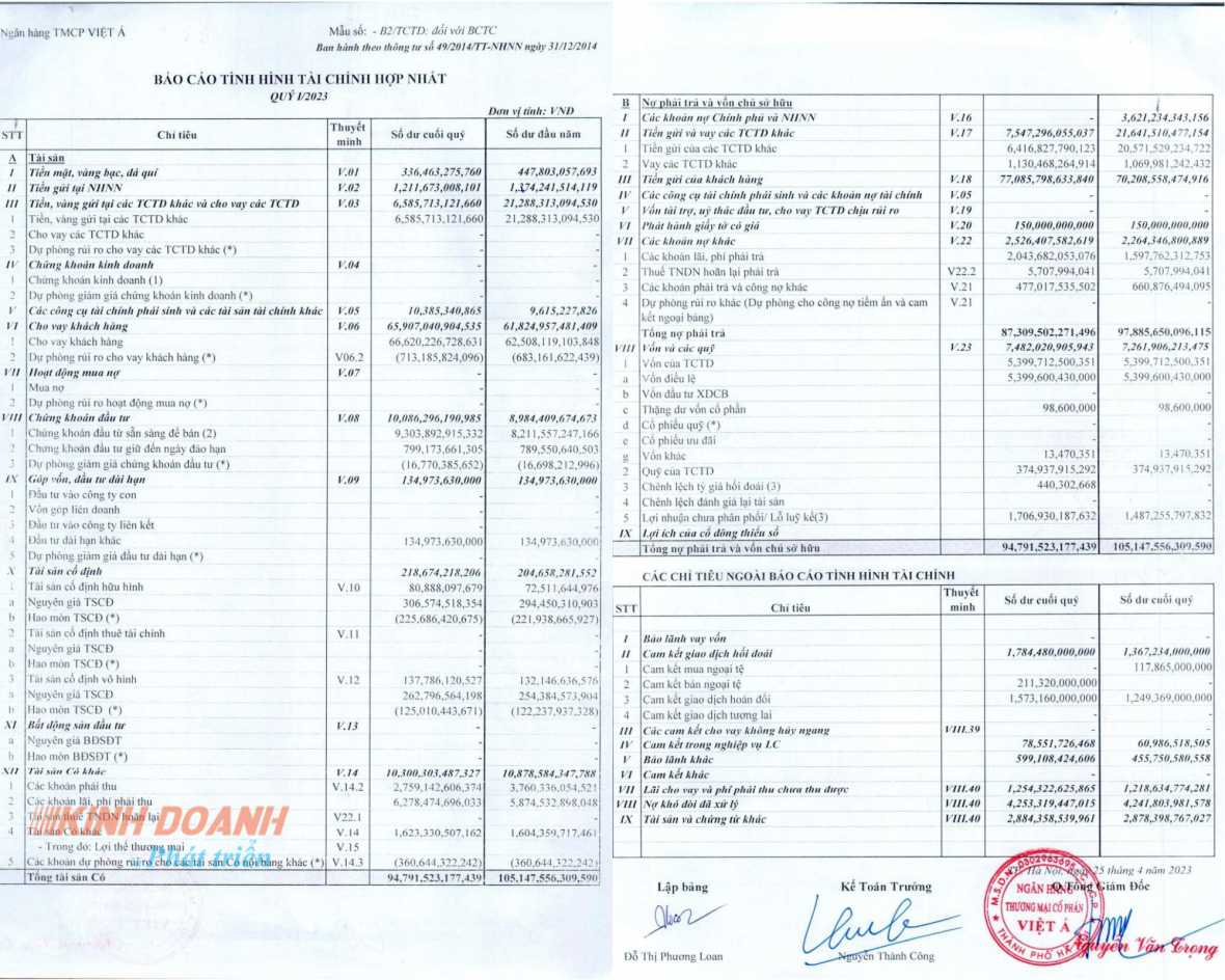 Báo cáo tài chính hợp nhất quý I/2023 – Ngân hàng TMCP Việt Á (VietABank). |