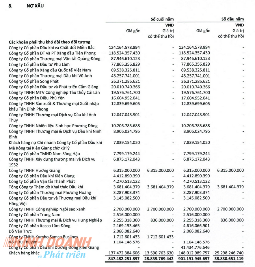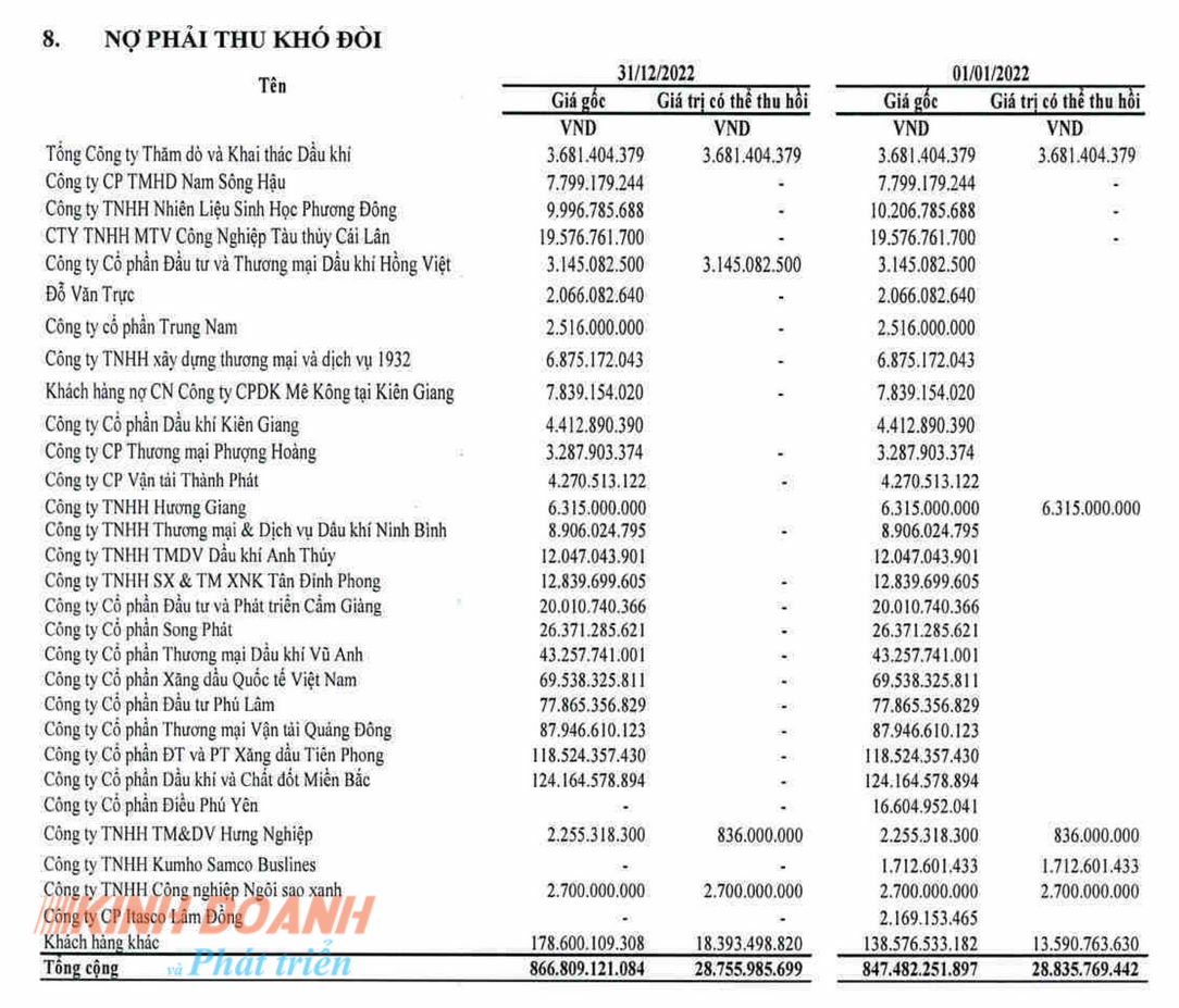 Đáng chú ý là nợ xấu PVOIL tính tới ngày 31/12/2022 lên đến gần 875 tỷ đồng với hàng chục doanh nghiệp, nhưng giá trị thu hồi ước tính chỉ là 32,7 tỷ đồng (tương đương 3,7 %). Trong đó, CTCP Dầu khí và Chất đốt Miền Bắc (124,2 tỷ đồng), CTCP ĐT và PT Xăng dầu Tiên Phong (118,5 tỷ đồng), CTCP Vận tải Thương mại Quảng Đông (88 tỷ đồng).... là những bên có số nợ phải thu khó đòi lớn với PVOil.
