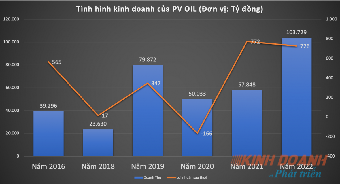 Theo Báo cáo tài chính hợp nhất đã kiểm toán, kết thúc năm 2022, doanh thu thuần của PVOIL đạt 104.214 tỷ đồng, tăng 80% so với năm 2021 và là con số cao nhất từ trước đến nay. Trừ đi các chi phí, lợi nhuận sau thuế của công ty còn 723,2 tỷ đồng, tương đương giảm 6,8%. Con số này bao gồm lợi nhuận sau thuế công ty mẹ gần 651,2 tỷ đồng; cổ đông không kiểm soát hơn 72 tỷ đồng.