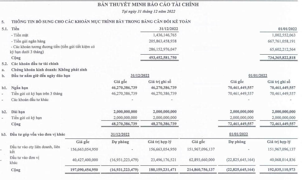 Ngoài ra, tính đến cuối năm 2022, tiền và tương đương tiền còn hơn 493 tỷ đồng, trong đó có hơn 491 tỷ đồng tiền gửi không kỳ hạn và kỳ hạn dưới 3 tháng tại ngân hàng. Ngoài ra còn có khoản gửi dài hạn hơn 48 tỷ đồng.