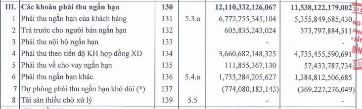 Chưa kể, còn hơn 3.660 tỷ đồng phải thu theo tiến độ và 1.733 tỷ đồng phải ngắn hạn khác bao gồm ký cược, ký quỹ (442 tỷ đồng), tạm ứng cho nhân viên (190 tỷ đồng), phải thu bên liên quan (3,7 tỷ đồng), phải thu khác (1.097 tỷ đồng).