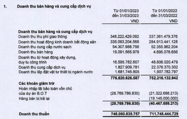 Đóng góp chính vào cơ cấu doanh thu trong quý là từ hoạt động thu phí giao thông 348 tỷ đồng và từ hoạt động kinh doanh bất động sản 335 tỷ đồng, lần lượt tăng 3,3% và 17,5%.