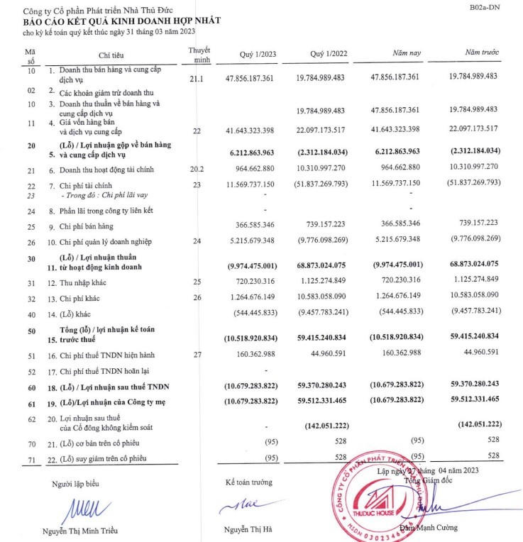 Báo cáo tài chính hợp nhất quý I/2023 của Thuduc House |