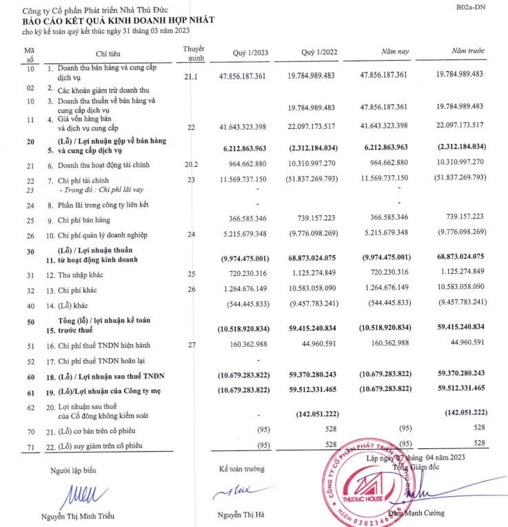 | Báo cáo tài chính hợp nhất quý I/2023 của Thuduc House |