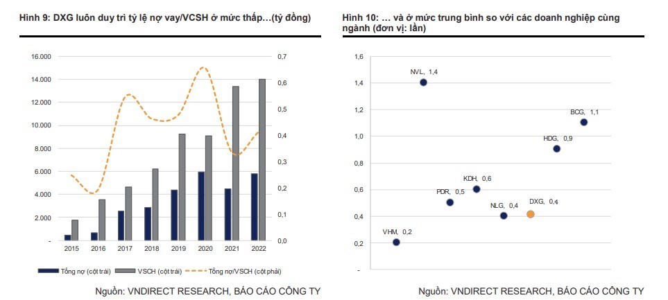 DXG có cơ cấu nợ vay đang được duy trì khá tốt. Tổng nợ vay của DXG vào cuối năm 2022 là 5.772 tỷ, tăng 28,8% so với cùng kỳ, tuy nhiên vốn chủ sở hữu cũng tăng 47,7% so với cùng kỳ giúp cho tỷ lệ nợ vay/VCSH được duy trì ở mức khá thấp chỉ 0,4x. VNDirect cho rằng đây là tỷ lệ nợ/VCSH khá an toàn khi so với các công ty vốn hóa trung bình có cùng mô hình kinh doanh.