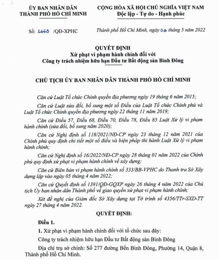 Theo đó, ngày 4/5/2022, UBND TP Hồ Chí Minh đã ra quyết định xử phạt số 1468/QĐ-XPH, xử phạt Công ty TNHH Đầu tư BĐS Bình Đông số tiền 500 triệu đồng cho lỗi hành vi “kinh doanh bất động sản mà bất động sản đó không đảm bảo đầy đủ các điều kiện theo quy định hoặc không được phép đưa vào kinh doanh theo quy định”. Lỗi vi phạm trên được quy định tại Điểm a khoản 3 Điều 58, Nghị định số 16/2022/NĐ-CP ngày 28/1/2022 của Chính phủ.