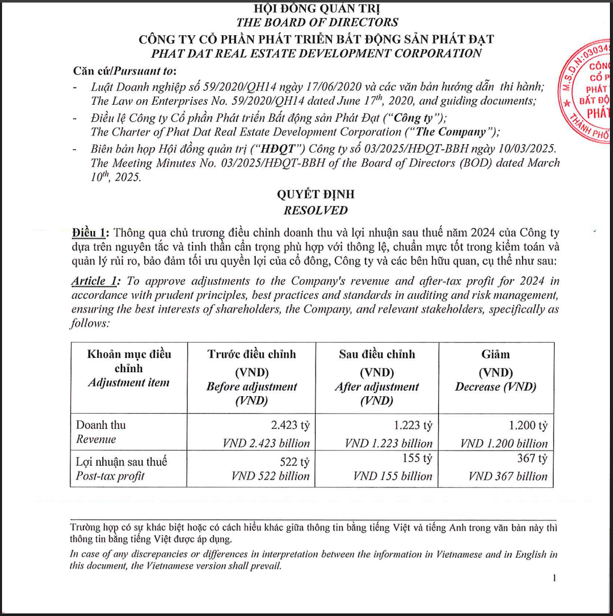 Ở một diễn biến khác, HĐQT Phát Đạt đã thông qua nghị quyết điều chỉnh doanh thu, lợi nhuận sau thuế năm 2024.
