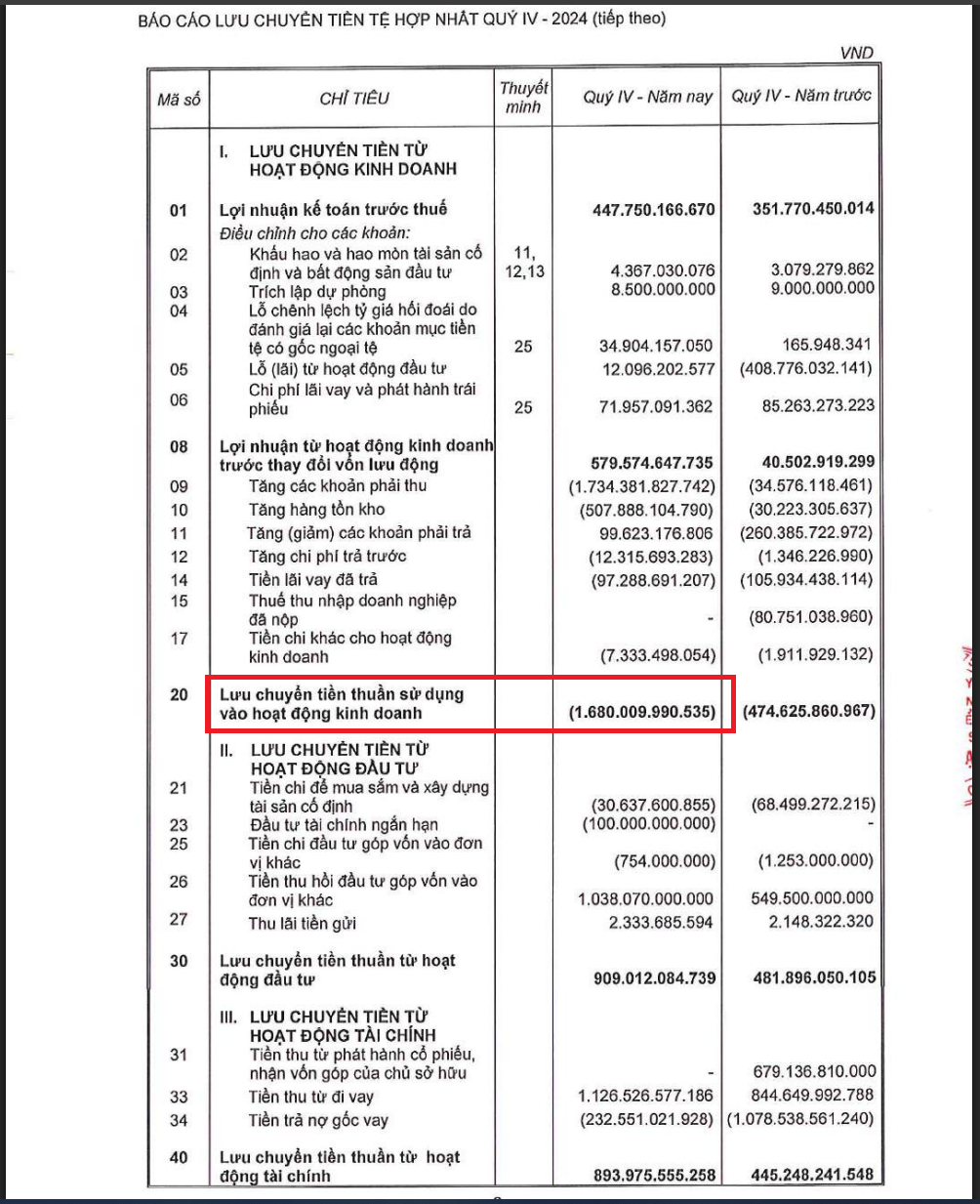 Trong quý IV/2024, dòng tiền kinh doanh của CTCP Phát triển Bất động sản Phát Đạt (HoSE: PDR) âm 1.680 tỷ đồng cho thấy tình hình kinh doanh u ám của doanh nghiệp này.