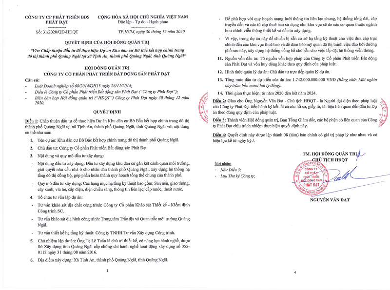 Cụ thể, theo công bố trên website chính thức công ty, Hội đồng quản trị của Công ty cổ phần Phát triển Bất động sản Phát Đạt đã có quyết nghị chấp thuận đầu tư thực hiện dự án Khu dân cư Bờ Bắc kết hợp chỉnh trang đô thị thành phố Quảng Ngãi tại xã Tịnh An, Tp. Quảng Ngãi, tỉnh Quảng Ngãi.
