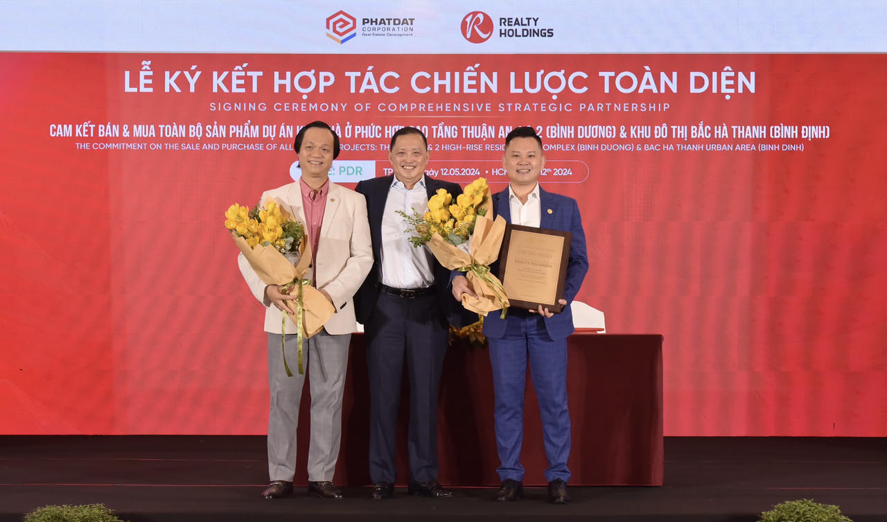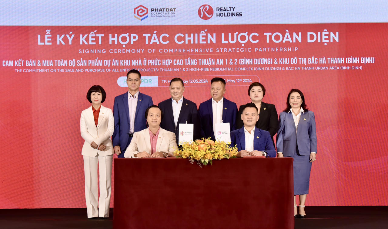 Sáng ngày 12/5/2024, Công ty Cổ phần Phát triển Bất động sản Phát Đạt (Mã chứng khoán HoSE: PDR) và Công ty Cổ phần Kinh doanh & Dịch vụ Bất động sản Realty Holdings cùng thực hiện Lễ ký kết hợp tác chiến lược toàn diện cam kết bán & mua toàn bộ sản phẩm dự án: Khu Nhà ở Phức hợp Cao Tầng Thuận An 1 & 2 (Bình Dương) và Khu Đô thị Bắc Hà Thanh (Bình Định).