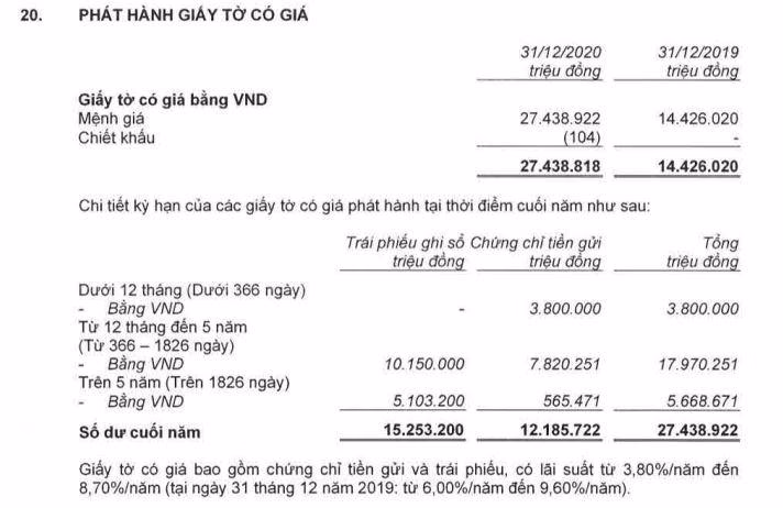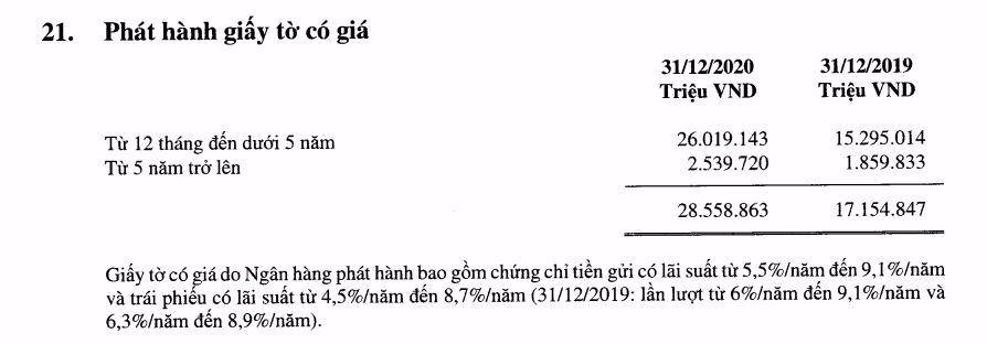 Tại VIB, năm 2017 phát hành giấy tờ có giá đạt 9.045 tỷ đồng, sau 3 năm con số này đã lên tới gần 28.559 tỷ đồng (năm 2020). Tại LienVietPostBank, con số này cũng tăng từ 6.157 tỷ đồng năm 2017 lên 32.251 tỷ đồng năm 2020.