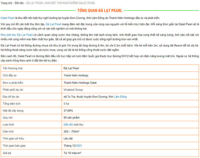 Tuy nhiên, ngoài những thông tin đăng tải trên website của CTCP Phát triển Bất động sản Thanh Niên Holdings và người bán quảng bá trên mạng xã hội, "Dự án khu biệt thự nghỉ dưỡng Đà Lạt Pearl" không hề có thêm thông tin pháp lý nào.