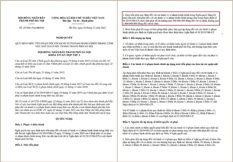 HĐND TP Hà Nội khóa XVI vừa thông qua Nghị quyết số 19 quy định mức tiền phạt đối với một số hành vi vi phạm hành chính trong lĩnh vực đất đai ở nội thành thành phố.