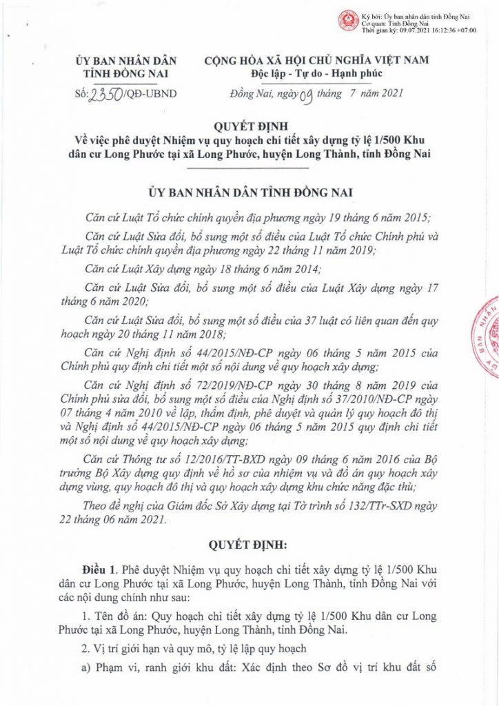 Mới đây, UBND tỉnh Đồng Nai vừa ban hành Quyết định số 2350/QĐ-UBND về việc phê duyệt Nhiệm vụ quy hoạch chi tiết xây dựng tỷ lệ 1/500 Khu dân cư Long Phước tại xã Long Phước, huyện Long Thành, tỉnh Đồng Nai.