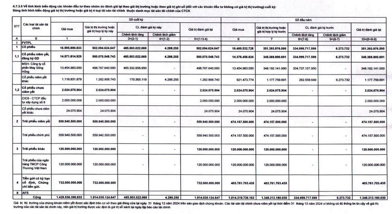 Quý IV/2024, FPTS thu lời lớn từ cổ phiếu MSH của May Sông Hồng. Lợi nhuận sau thuế của công ty đạt hơn 160 tỷ đồng, tăng gấp 3,8 lần cùng kỳ.
