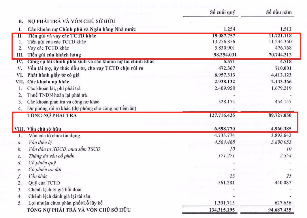 Trong khoản nợ phải trả trên chủ yếu là khoản nợ tiền gửi của khách hàng tăng 39%, lên mức 98.254 tỷ đồng; khoản nợ tiền gửi và vay các tổ chức tín dụng khác cũng tăng 63% đạt 19.087 tỷ đồng;…