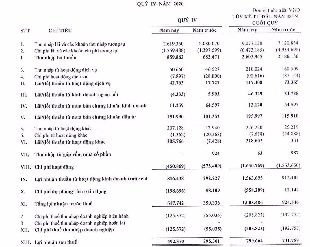 Cả năm 2020, thu nhập lãi thuần của ngân hàng đạt 2.604 tỷ đồng, tăng 19% và chiếm 81,5% tổng thu nhập hoạt động. Lãi thuần từ hoạt động dịch vụ, kinh doanh ngoại hối và chứng khoán đầu tư lần lượt tăng 60%, 87% và 69% so với năm 2019.