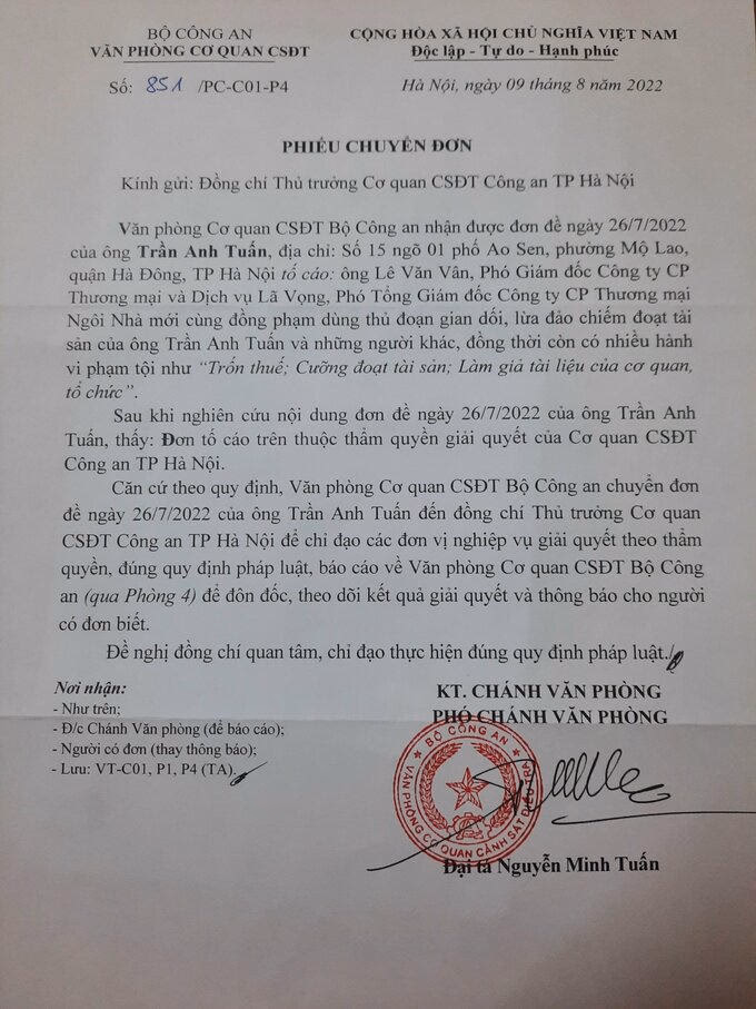 Được biết, Ngày 09/08/2022, Văn phòng Cơ quan CSĐT Bộ Công an đã có phiếu chuyển đơn số 851/PC-C01-P4 đến Thủ trưởng Cơ quan CSĐT Công an TP Hà Nội để điều tra theo thẩm quyền liên quan đến đơn tố giác 02 pháp nhân thương mại và ông Lê Văn Vân – Phó Giám đốc Công ty CP Thương mại và Dịch vụ Lã Vọng, Phó Tổng Giám đốc Công ty CP Thương mại Ngôi Nhà Mới.