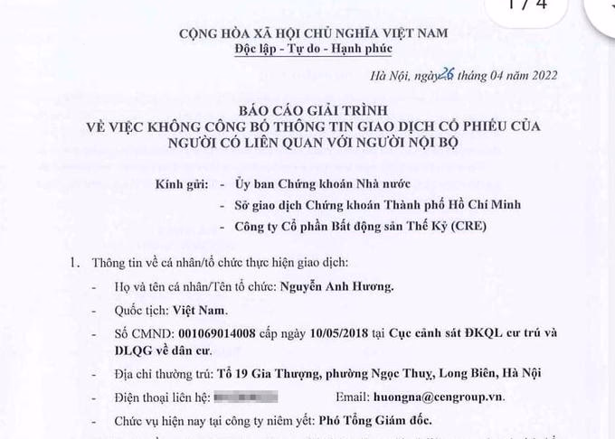 Cụ thể, ngày 26/04/2022, ông Nguyễn Anh Hương đã có báo cáo giải trình gửi Ủy ban chứng khoán Nhà nước, Sở giao dịch Chứng khoán thành phố Hồ Chí Minh về việc đã “bán chui” 19.900 cổ phiếu CRE. Trước đó, ngày 17/02/2022, ông cũng đã mua vào 100 cổ phiếu CRE mà không tuân thủ theo quy định của pháp luật.