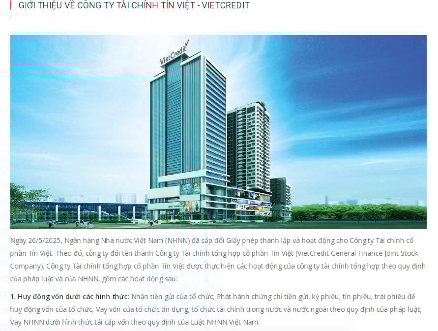 Ngày 26/5/2025, Ngân hàng Nhà nước Việt Nam (NHNN) đã cấp đổi giấy phép thành lập và hoạt động cho Công ty Tài chính cổ phần Tín Việt. Theo đó, công ty đổi tên thành Công ty Tài chính tổng hợp cổ phần Tín Việt (VietCredit General Finance Joint Stock Company).