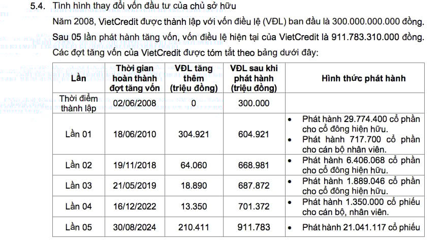 Năm 2010, công ty tăng vốn điều lệ lên gần 605 tỷ đồng. Đến năm 2018, công ty đổi tên thành Công ty Tài chính cổ phần Tín Việt (VietCredit). Đồng thời, tăng vốn điều lệ lên hơn 668,98 tỷ đồng.