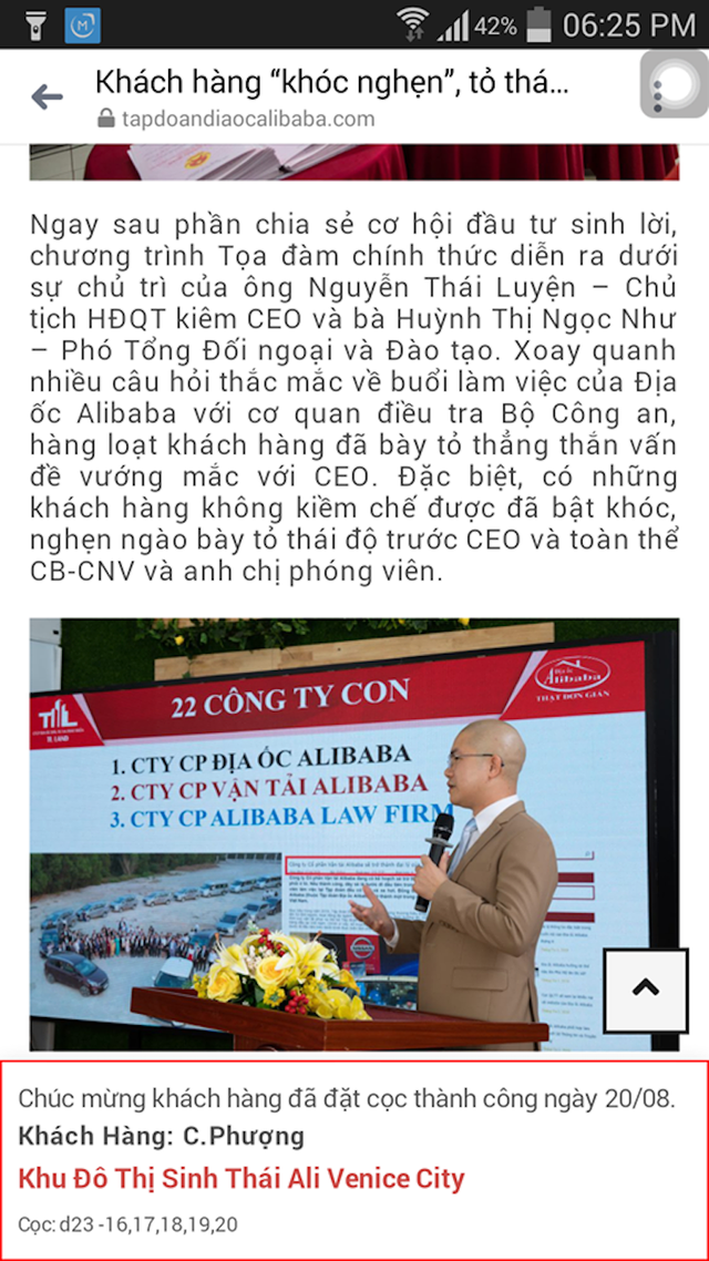 Theo đó, tại buổi tọa đám, ông Nguyễn Thái Luyện đã quảng bá về uy tín của địa ốc Alibaba. Đồng thời, ông Luyện cũng hứa hẹn sẽ trả lại tiền cho khách hàng nếu khách hàng báo cho công ty về việc muốn nhận lại tiền đầu tư do lo lắng khi mua sản phẩm của địa ốc Alibaba. Chưa hết, ông Luyện còn thể hiện “lòng tốt” khi bày tỏ mong muốn đưa địa ốc Alibaba phát triển rộng ra 63 tỉnh thành để giúp khách hàng giàu có và tạo việc làm cho người dân.