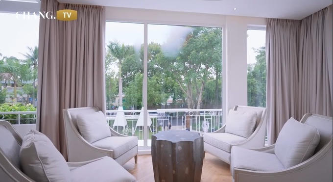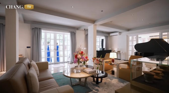Bước vào bên trong, phòng khách được trang trí theo phong cách tối giản nhưng sang trọng, với sắc hoa tươi thắm thể hiện sự chăm chút và tinh tế của gia chủ. Phong cách thiết kế tối giản nhưng tinh tế này cũng được Lý Thùy Trang áp dụng cho không gian phòng ngủ.
