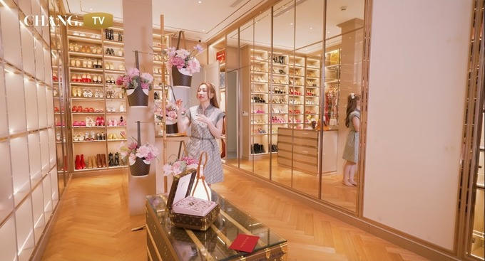 Bên cạnh phòng ngủ là một phòng chứa đồ với đầy ắp các món hàng hiệu. Mặc dù không quá rộng lớn, nhưng căn phòng được sắp xếp gọn gàng, khiến nhiều người liên tưởng đến những cửa hàng thời trang cao cấp.