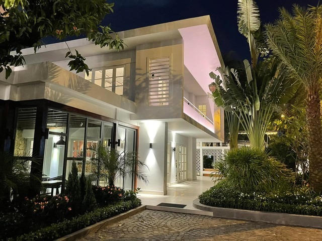 Căn biệt thự nổi bật với kiến trúc hiện đại, mang phong cách như một khu nghỉ dưỡng với sân vườn rộng rãi. Giữa khuôn viên là một hồ bơi lớn, nơi vừa là góc "sống ảo" triệu view, vừa là chỗ thư giãn cho hai vợ chồng sau những giờ làm việc căng thẳng.