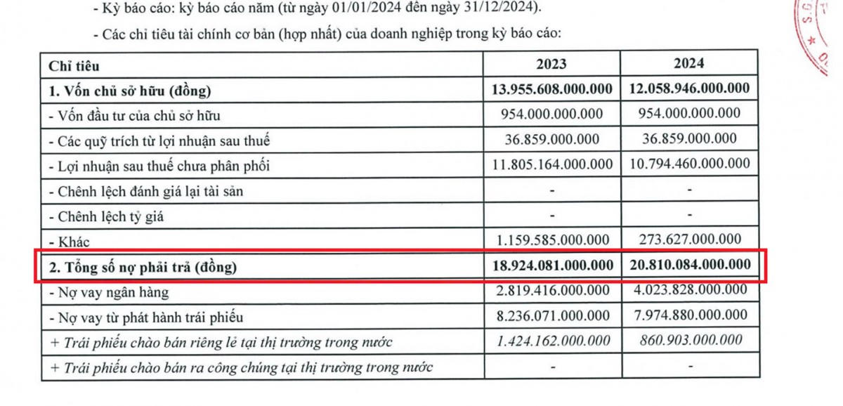 Tính đến hết ngày 31/12/2024, bức tranh tài chính của Phú Mỹ Hưng cho thấy sự gia tăng về quy mô nợ. Tổng nợ phải trả của công ty đạt hơn 20.810 tỷ đồng, tăng 1.886 tỷ đồng so với cuối năm 2023. Sự gia tăng này chủ yếu đến từ việc dư nợ vay ngân hàng tăng mạnh từ khoảng 2.819 tỷ đồng lên gần 4.024 tỷ đồng. Ngược lại, dư nợ trái phiếu phát hành lại giảm hơn 260 tỷ đồng, còn gần 7.975 tỷ đồng.