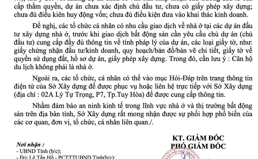 Nhằm đảm bảo an ninh kinh tế trong lĩnh vực nhà ở và thị trường bất động sản trên địa bàn tỉnh, Sở Xây dựng Phú Yên cũng khuyến cáo các tổ chức cá nhân có nhu cầu giao dịch về nhà ở tại các dự án đầu tư xây dựng nhà ở, trước khi giao dịch bất động sản cần yêu cầu chủ dự án cung cấp đầy đủ thông tin về tính pháp lý của dự án.