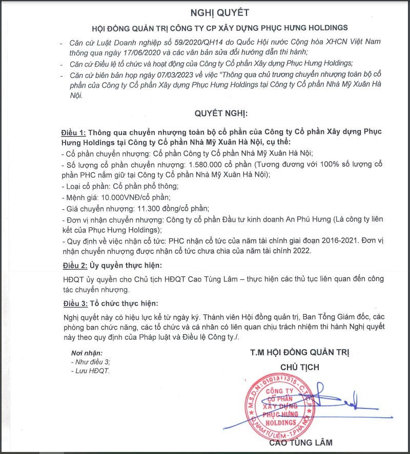 HĐQT CTCP Xây dựng Phục Hưng Holdings (mã CK: PHC) vừa thông qua giao dịch chuyển nhượng toàn bộ cổ phần đang nắm giữ tại CTCP Nhà Mỹ Xuân Hà Nội.