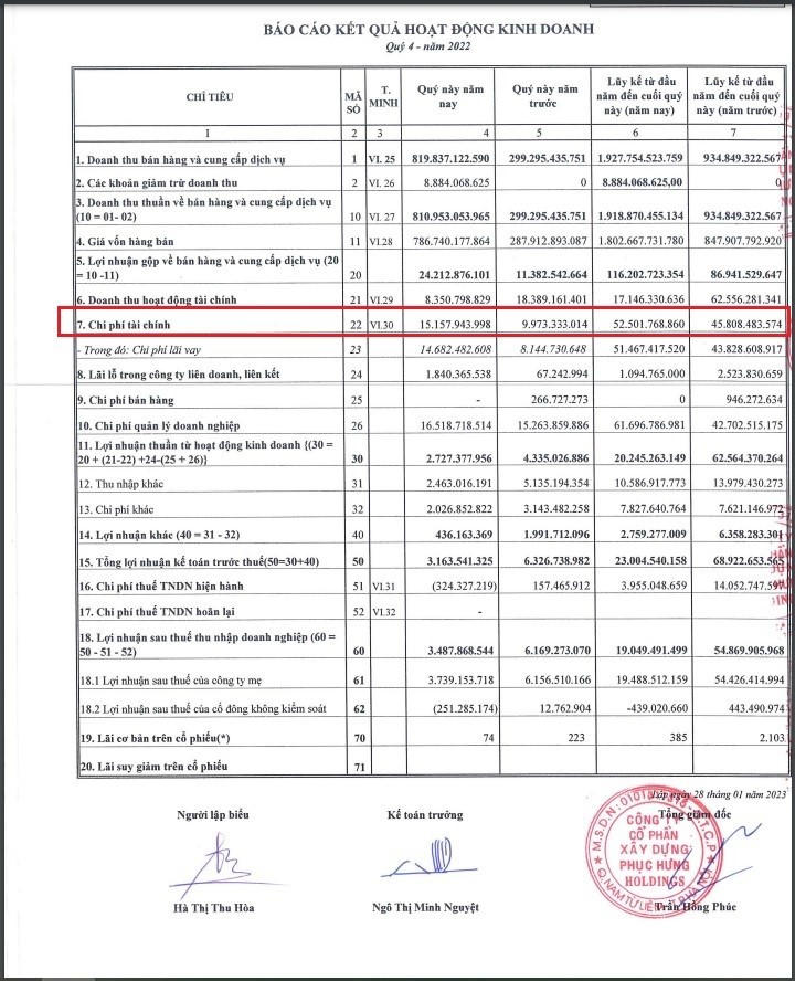 Lũy kế năm 2022, với việc chi phí tài chính tăng 15% (đạt 52,5 tỷ đồng), chi phí quản lý tăng 45% (đạt 61,7 tỷ đồng) đã kéo lợi nhuận trước thuế của PHC giảm tới 66%, chỉ còn 23 tỷ đồng. Lợi nhuận sau thuế giảm 65%, còn 19 tỷ đồng.
